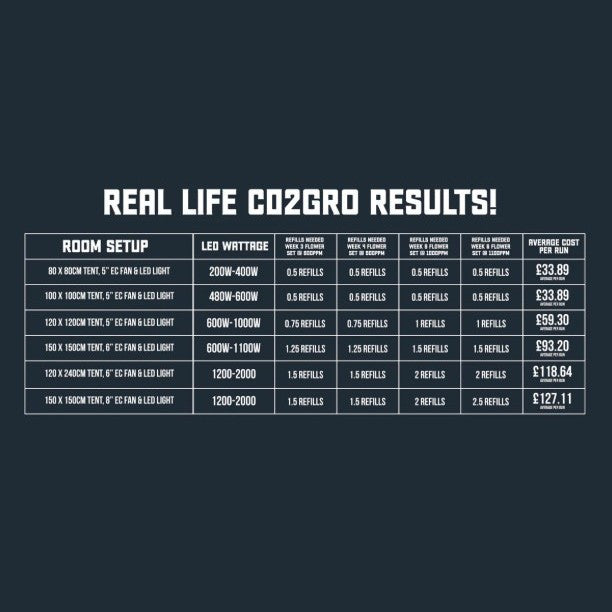 The CO₂GRO system has been extensively trialled across a variety of popular grow tent sizes and lighting setups. Real growers have reported noticeably increased biomass, faster veg times, and denser flowers when maintaining CO₂ levels between 1,000–1,200 ppm.